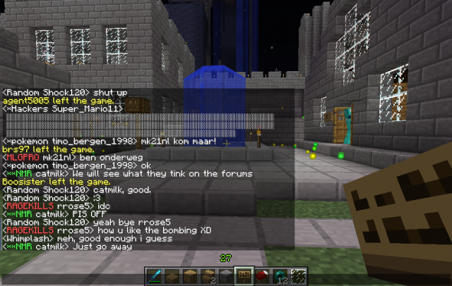 Yesterday (20th June) On the Minecraft server. The faction MLG attacked NMR, due to the fact that they took us by surprise and we were out numbed we retreated back to our old base witch is still claimed in the name of NMR) The fortress is virtually impenetrable due to its position in the side of a mountain and the number of layers on top of it were designed to withstand TNT attacks and creepers. Me (Catmilk) and Ilovehorseriding were attempting to wait out the siege in a room in-cased in 4 layers of cobblestone, a member of MLG somehow glitched through the 4 layers of cobble and killed us both. When i challenged them on it they said that it wasn't cheating and that using glitches like that is allowed. So this got me thinking, whats the point in keeping doors closed if they can just glitch through them? Whats the point if building tall walls that are 3-4 layers thick if they can just glitch through them? i think that you will agree that this cannot be allowed and MLG and any others who abuse glitches like this must either be told to stop doing so or be banned. Thank you for reading and i hope that you feel the same way about this issue which i must say bothers me deeply.
