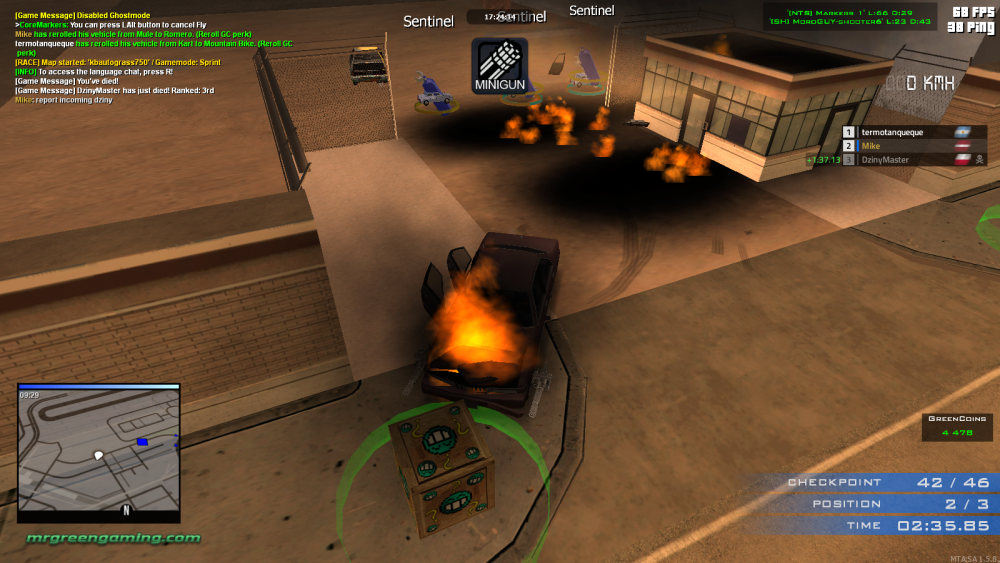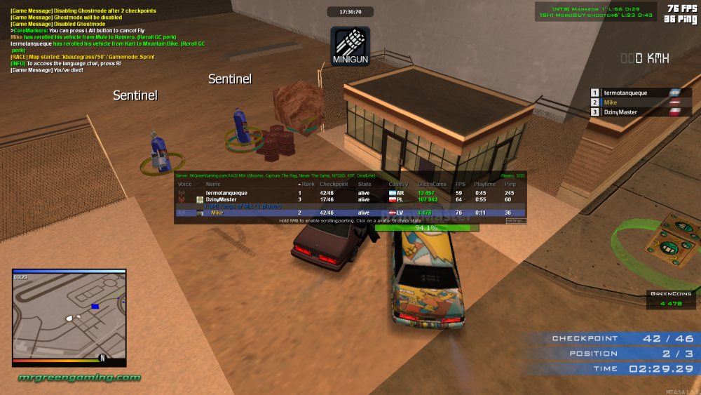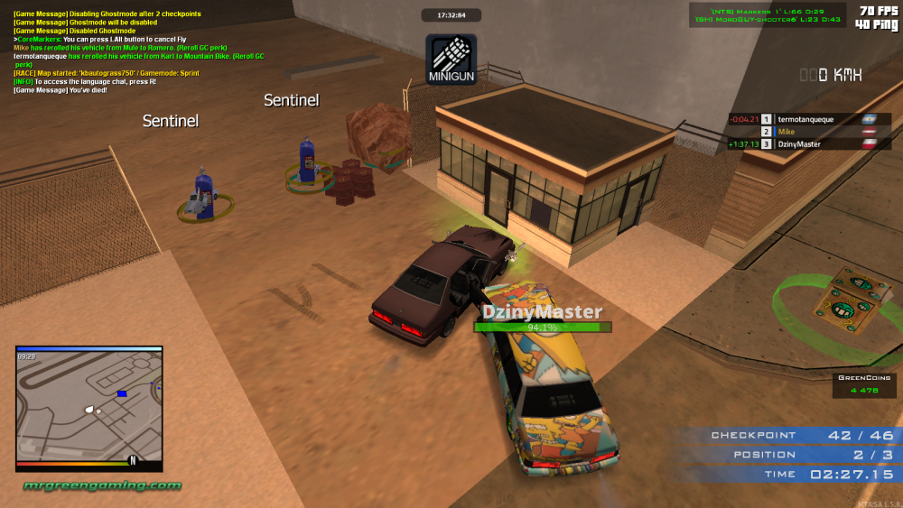 In map Markers 1, one part of the map is in LS airport and finish line is near by exiting the airport. Dziny skips most of the checkpoints, grabs hay, barrel, spike and oil markers and puts them all at the exit of the airport, ruining the time for whoever is 1st. Screens show what he has placed at the moment, he also drove into the barrels and blew me up and in TAB you can see how I was on my 42 of 46 checkpoints while Dziny was only on 17.