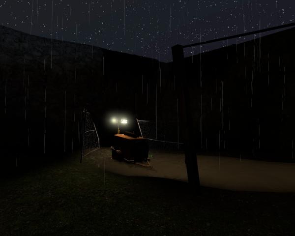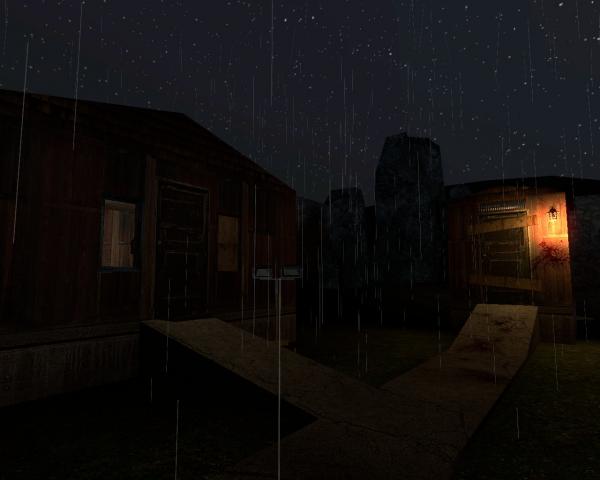 Here is a screenie where I have used high density rain and thanks to Mr.Darkness for his random sounds contraption I changed the sounds to thunder and the atmoshpere is quite unbelievable! p.s Easteregg Pimphouse on the cliff. p.s.s might turn put to be a secret or just an interesting target for some headcrab canisters.. oooh fire..