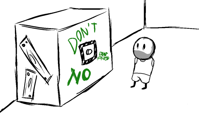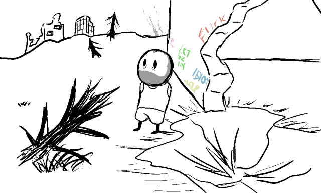 Hello again! Before we start, I would like to explain some things, such as what is different from the old version and the current one. Instead of Gmod poses, I'll be using style much like Redgord's roomguy (and various other interactive adventures), as this allows me to pop new stuff out faster, and it's more pleasant me to do. I'll let you decide what to do at first, but if that doesn't work we'll be moving back to the ABCD kind of way. To newcomers, this is an interactive story where the readers (you!) decide what the main character should do next (what actually happens is up to me though) Feel free to ask any questions if you have any. I'll try my best to keep this up as long as my lazyness will let me. Ready? Good, let's go then! 2 years later... 2 years since you last saw sunlight, 2 years since you met another person, 2 years since you last ate something that wasnt makeshift food made out of plasma televisions. It's been 2 years since YOU, Joseph Dé Hundre fortified yourself inside what used to be GREENCOIN MEGASTORE, to wait for rescue. But it never came. Not to mention as you made your BARRICADE better and better, the building eventually became SOUNDPROOF. However, after 2 long years the building that also used to be filled with all sorts of things to buy, is now what looks like an empty storage room. Everything that used to be in this building is now either eaten by you or used for the barricade, even your old weapons and EQUIPMENT (with expection of few clothes) Speaking of EQUIPMENT, let's have a look at our current INVENTORY! Not much for now, all you have is CASUAL LOOKING TANK TOP, HUNDRANCE MILITARY STANDARD ISSUE PANTS and HUNDRANCE MILITARY STANDARD ISSUE BOOTS. Over the years, the condition of all these is now LOW. The stuff on the left with lines to the character are for your ARMOR and CLOTHING. The boxes with pictures of hands next to them show the WEAPONS you currently have equipped. Other boxes are SPARE SLOTS of your INVENTORY. This is your largest, and only achievement during your 2 years here. THE BARRICADE, as you like to call it. It's made out of pretty much everything that used to be at the store. However, in your sillyness only way to remove it is to press the button, which destroys THE BARRICADE. It has to go now, or else you'll die to hunger. You give THE BARRICADE last brofist it will ever get. THE BARRICADE explodes cleanly with a loud "SWOOOOOSH" sound. It takes you couple of seconds to get used to fresh air and sunlight. World seems somewhat more destroyed now for reason. There are some WRITINGS on the wall, but by the looks of it they have been there for a while now. In the distance, you see some DESTROYED BUILDINGS, and even further away some SMOKE. Thought of meeting A FELLOW HUMAN comes in to mind, but you are not sure if thats a nice or scary feeling. In any case, sound of the explosion of THE BARRICADE must have carried miles away, and there is no shelter back at the GREENCOIN MEGASTORE anymore either. Better think quick.