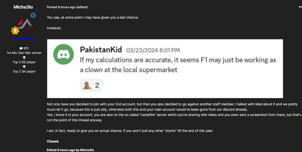 I don't even remember talking to that guy. I prefer to ignore his provocations, I remember before I was banned, he said something about banning me "for fun", which I thought was a joke, so I replied with jokes. There are dozens of users who break the rules every other day (politics, racism etc.), yet I am the one who was targeted. Even in January, I was the one muted for a week by that same Manager even though it was clearly Nick1921 who provoked first.