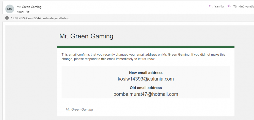 I just received an email from you saying that my account email address has been changed by someone else and you want me to respond to this email immediately if I haven't changed it and I did immediately. I point out that I did not do this and I am currently unable to log into my existing account.