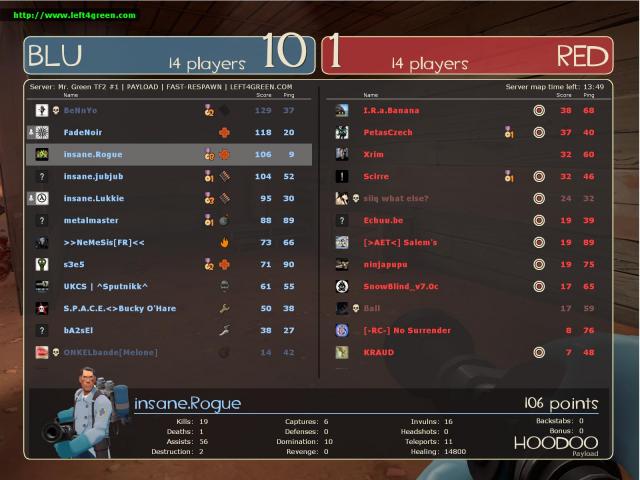 that where only 5 guys i remember including me. but they never played all together in one team and not even played all every time medic. now you got a lot of guys that all want the fast uber. because that's the big advantage. so now you got more guys with fast ubers and the guys that donated before for there fast ubers in the old system don't even playing any more because this is happened and because there was a epic class update (soldier/demo that fucked up the game a little bit). i would like to see the guys with non fast ubers. then you can see again who are the best medics. i got the fast uber ass well but i dont care if i loose it i played medic before the donater stuff but i had still a good score so. and that would be a good change for the pl server. i play in the cp server ass well but in the cp server it isn't so stacked. but i play now 2/3 years in the pl server and dont want to leave the server. but if this still going on i will make a change to the cp/ctf server and or the koth server (but there are not many good players in koth so that's boring) ''charge and sometimes 2 who'd just launch it right after each other. You get used to that.'' not every minute i believe. thats just the problem in pl and engie yeah its fucked up with the new class update. they got too much advantage if they shoot pipebombs at your sentry or rockets. i think they got more damage now. check i dont think that its true. never saw a demo destroying a sentry with 2 epic pipebombs before. its just annoying to play engie right now.