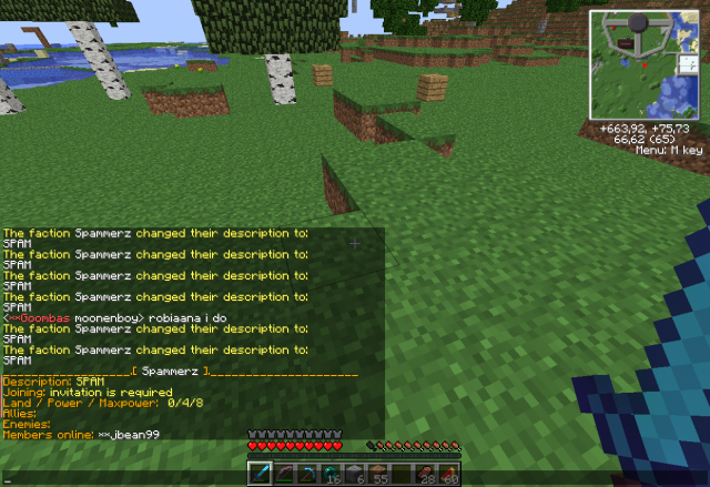 Some of you know that the Minecraft server has a plugin installed called "SpamGuard" It's a great plugin, but only when it does it's job. I've had difficulty's with it, just like many others. For example, when you want to go f home and already done that quite a few times, you get blocked by the plugin which makes it so that you can't say that line of text anymore. Only after you've said some other words you can finally type that message again. It's not a big deal when you're in your base, but it can be fatal when in battle. So my question is "Can you customize this plugin so that it doesn't block some commands?" Like: f home, f c a, f c p, f c f, f unclaim, f claim or f sethome. It would make my life a lot easier and many others too I believe. So if it's possible and not too much to ask, can you please make it so? BTW if you have anymore suggestions about what can go in the list of things that should be allowed to "spam" please list it down below.