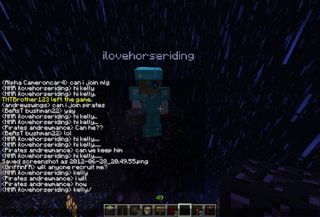 Name: ilovehorseriding server: mincraft.nl reason: spam she was spaming and also spaming xp potionsand ender eyes at me i dont know if that is punishable but it was annoying. ban 2.wmv ban.wmv