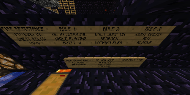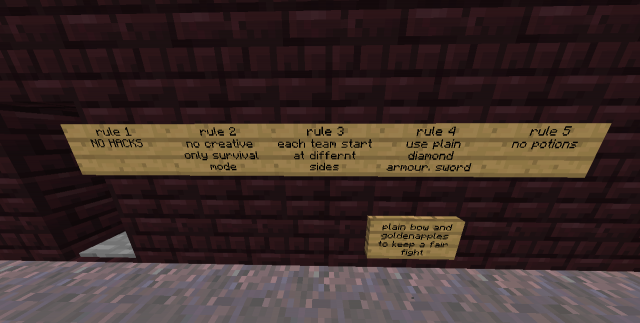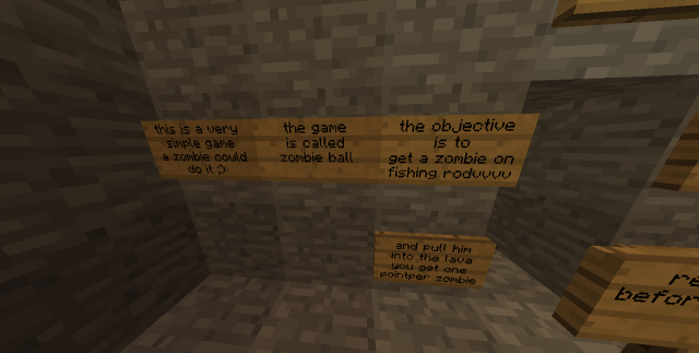 MLG's OLYMPIC GAMES players that helped: kellyanthony , 101spud map coordinates: 111,65,298 we have made several games in our base and connected to it. Main entrance is above the front door on the obsidian ball from there if you read signs you can find out how to get to all the games DODGE OR DIE how to play: -you must be in survival mode -only one person at a time -dodge blocks that come at you or you will be hit into lava -dont break anything JUMP COURSE how to play: - you must be in survival mode - no cheating /flying - you can only jump on bedrock not obsidian - you can go in creative to fly back to start or to your last save point (there is 4 save points) - dont break anything ARCHERY PVP ARENA How to play: - 2 teams 1-4 members per team - one team must leave faction and start another one and enemy MLG - each team starts at different sides of lava - last player/team alive wins - only use leather armour and plain bow - no hacks, potions, golden apples - dont break anything PVP ARENA How to play: - you need 2 teams 1-4 players per team - no hacks, potions, or golden apples - plain diamond armor and sword and plain bow to keep a even fight - each team starts a different sides - dont break anything SPLEEF everyone knows how to play spleef but just in case how to play: - you need 2 teams 1-4 players per team (red team) and (blue team) - everyone needs to be in the MLG faction to play - the objective is to break the snow out from under the other team players - use plain diamond shovel - each team go to different sides (entrances are labeled) MAZE How to play: - you need 2 teams 1-2 person per team(red team) (blue team) - no pvp - objective is to find the flag (purple wool) - each team will go in at different sides labeled in base how to get to it - player will count down from 3 than start all at same time - dont break anything ZOMBIE BALL last but not least a simple game ZOMBIE BALL how to play: - use a fishing rod - catch a zombie with fishing rod and throw him into the lava - no cheating(if you find a way) - dont leave the wood block - dont break anything