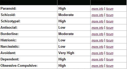Griffon Posted February 26, 2012 Posted February 26, 2012 Paranoid: Low Schizoid: Low Schizotypal: Moderate Antisocial: Low Borderline: Low Histrionic: Low Narcissistic: Low Avoidant: Low Dependent: Low Obsessive-Compulsive: Low Quote